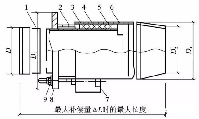 套筒补偿器是由填料密封的套管和外壳管组成的,两者同心套装并可轴向补偿,有单向和双向两种形式,图五是单向套筒补偿器。套筒与外壳体之间用填料圈密封,填料被紧压在端环和压盖之间,以保证封口紧密。填料采用石棉夹铜丝盘根,更换填料时需要松开压盖,维修方便。套筒补偿器的补偿能力大,一般可达250~400mm,占地小、介质流动阻力小、造价低,适用于工作压力小于或等于 1.6 MPa、工作温度低于300℃的管路上,补偿器与保温管道采用焊接连接。